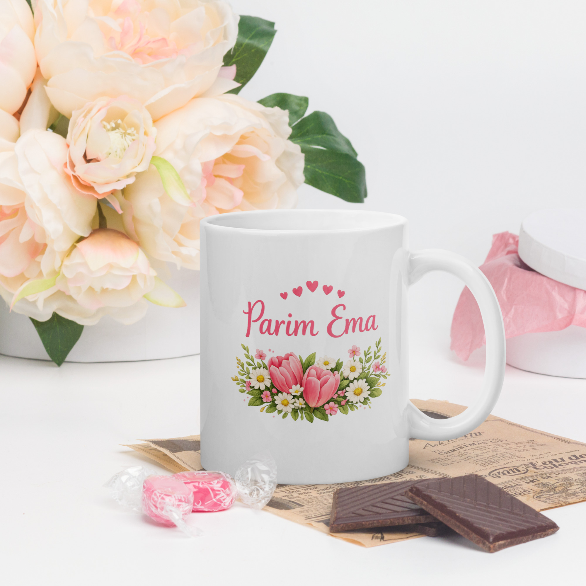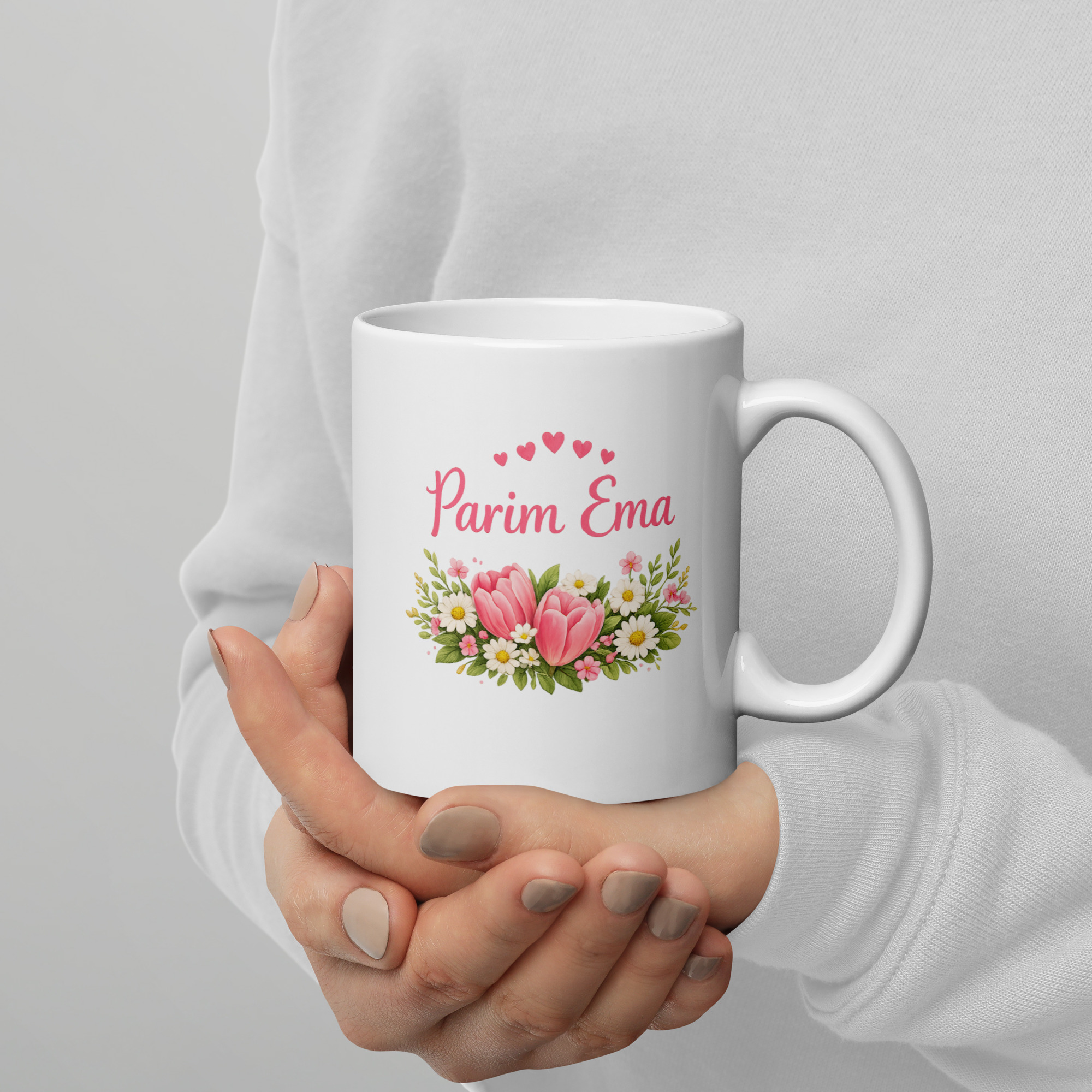 Kruusi kujundusel on elegantne tekst “Parim Ema”, mille kohal on viis väikest südant. See sümboliseerib armastust, tänulikkust ja hoolivust. Õrn lillekujundus lisab kruusile sooja ja emotsionaalse ilme, mis sobib ideaalselt emadepäeva kingituseks.