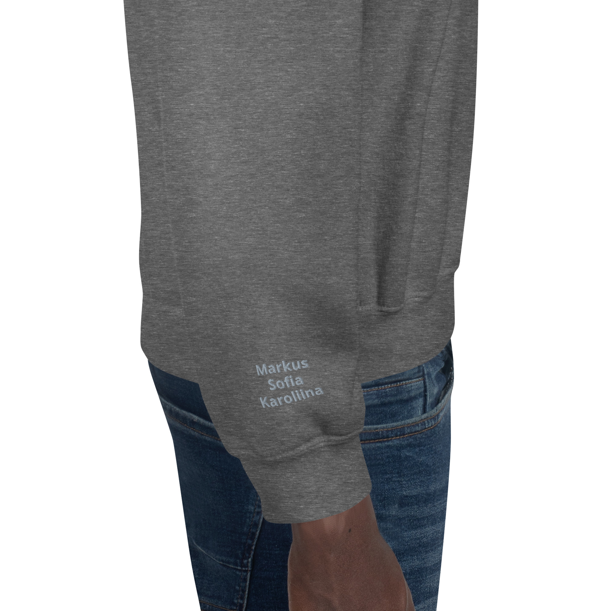 Vasakul rinnal on tikand “Vanaisa” ja paremal varrukal on tikandina laste nimed. See personaliseerimise võimalus lisab pusale erilise tähenduse ja muudab selle ainulaadseks.